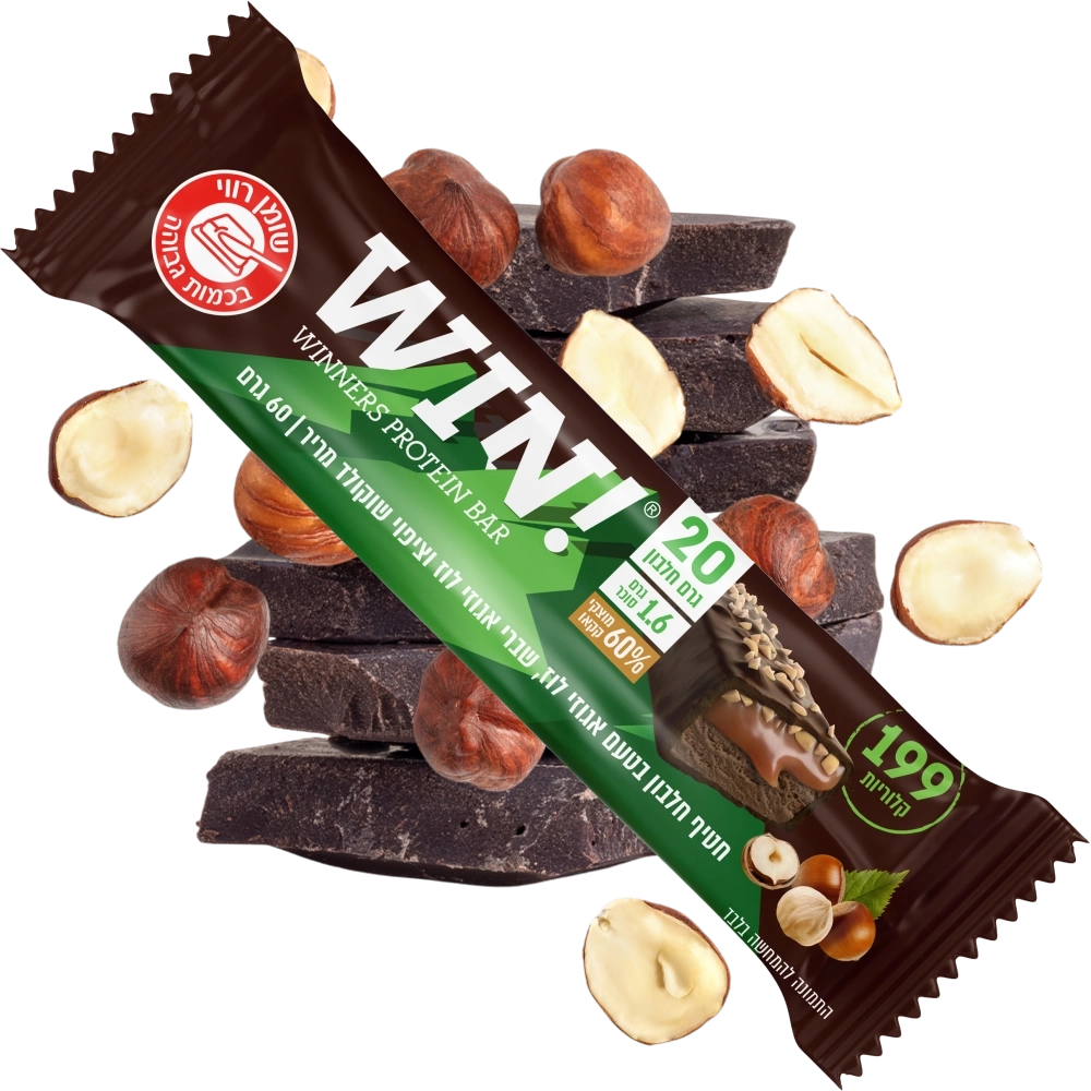 מארז 12 חטיפי חלבון בטעם אגוזי לוז מצופה בשוקולד מריר מעולה 60% ופצפוצי אגוזי לוז, עם 20 גרם חלבון ו-199 קלוריות בלבד של המותג WIN.