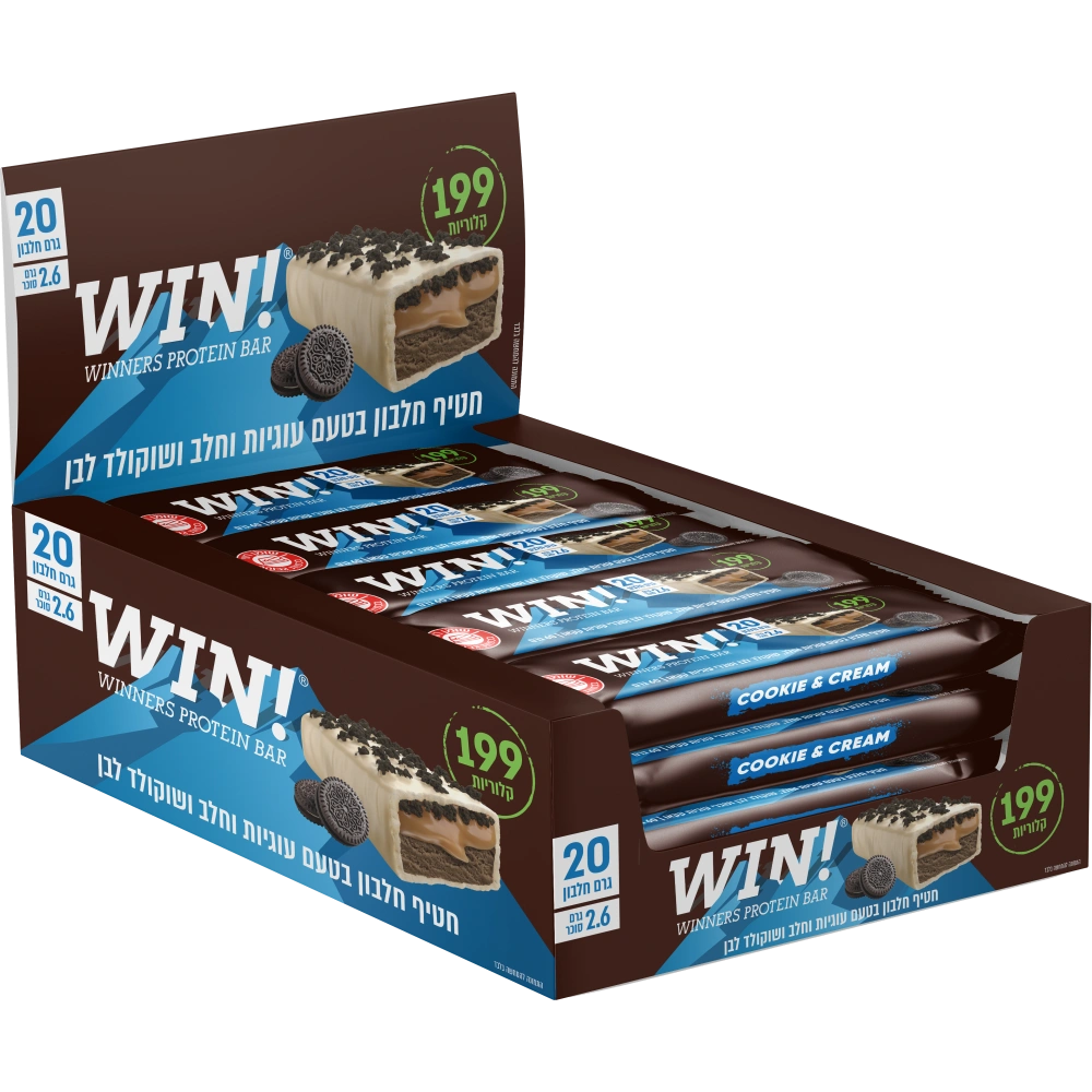 מארז 12 חטיפי חלבון בטעם בטעם עוגיות וחלב, שוקולד לבן ושברי עוגיות קקאו, עם 20 גרם חלבון ו-199 קלוריות בלבד של המותג WIN.
