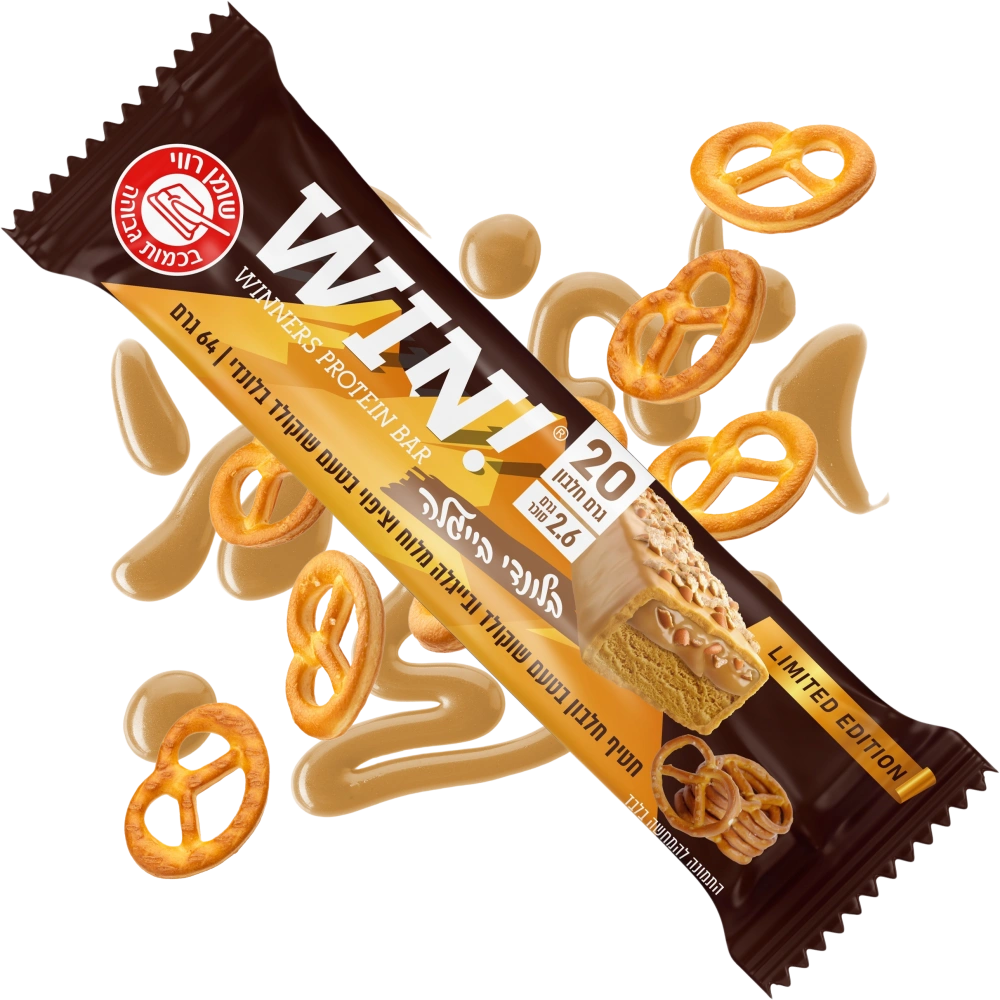 מארז 12 חטיפי חלבון בטעם שוקולד בייגלה מלוח עם שכבת קרמל מצופה קרם טופי ושוקולד בלונדי של המותג WIN.